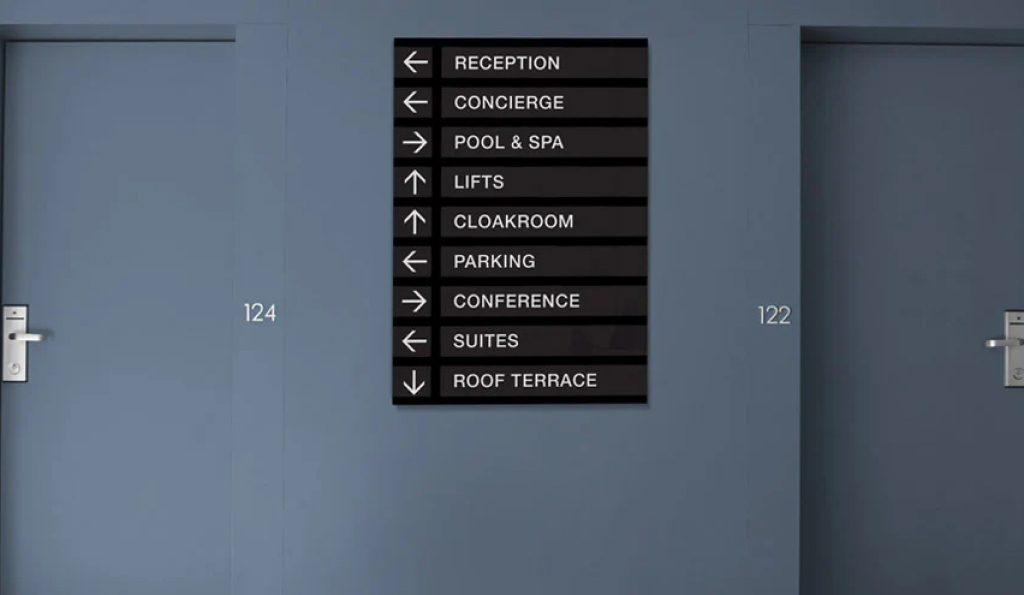 Agar tamu dapat bergerak dengan mudah dan tanpa kebingungan di dalam area hotel, sistem wayfinding harus dirancang secara strategis. Dua elemen kunci dalam sistem ini adalah signage penunjuk arah dan nomor ruangan. Masing-masing memiliki fungsi yang saling melengkapi dan harus dirancang dengan pendekatan visual yang konsisten: